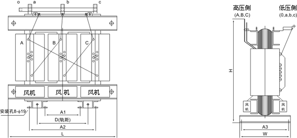 注:容量200kVA及以下不帶風機,否則在訂貨時需闡明。本表之外的規格和特殊要求可聯系洽談。